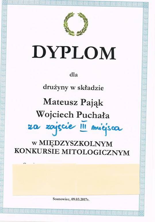 9 marca uczniowie naszej szkoły wzięli udział w międzyszkolnym konkursie mitologicznym organizowanym przez Gimnazjum nr 2. Musieli wykazać się znajomością nie tylko mitologii greckiej i rzymskiej, ale też frazeologizmów z nią związanych i kultury dawnych Greków. Nasza dwuosobowa drużyna w składzie Mateusz Pająk i Wojtek Puchała zajęła bardzo dobre III miejsce na 18 zespołów. Cieszy tym bardziej fakt, że jako jedyni z klas piątych tak doskonale wypełnili-bardzo trudne- testy. Chłopcy wykonali TYTANICZNĄ pracę, zachowali OLIMPIJSKI spokój i sięgnęli po laury. Bardzo dobrze spisali się również Marysia i Igor z klasy VI.