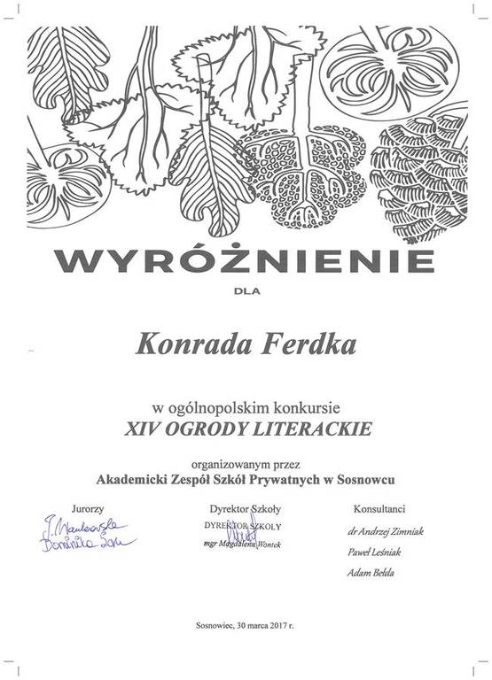 Z ogromną przyjemnością informuję, ze uczeń klasy V, Konrad Ferdek, odniósł ogromny sukces w XIV Ogrodach Literackich organizowanych przez Akademicki Zespół Szkół Prywatnych w Sosnowcu. Na konkurs wpłynęły prace z m.in.Opola, Raciborza, Gryfic. Konrad podjął się bardzo trudnej sztuki napisania felietonu, którego tajniki zgłębiał na zajęciach dodatkowych. Był jednymi z najmłodszych uczestników. Jury doceniło jego pracę, przyznając mu wyróżnienie. Warto przeczytać jego bardzo emocjonalne i ciepłe przemyślenia na temat praw zwierząt. Do konkursu przystąpił też Mateusz Pająk, pisząc o prawach uchodźców . Gratulacje dla chłopaków i życzenia dalszych sukcesów