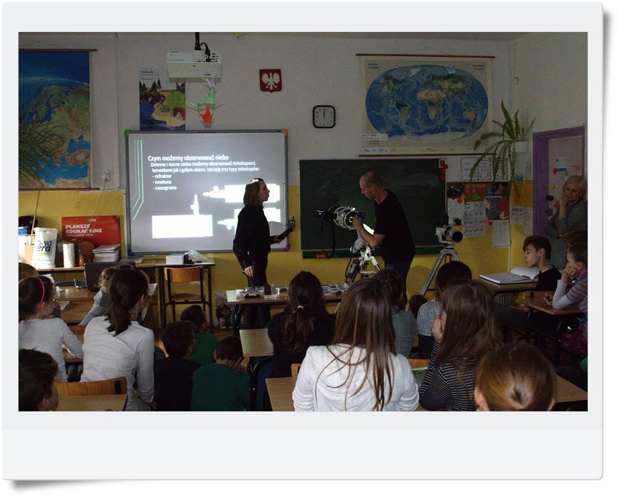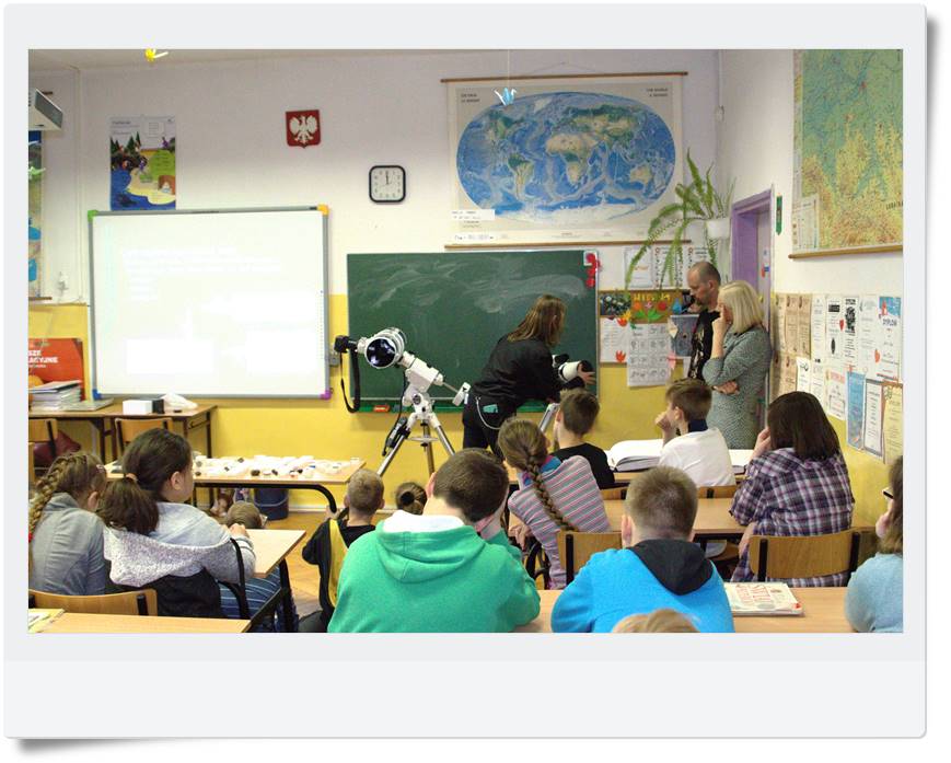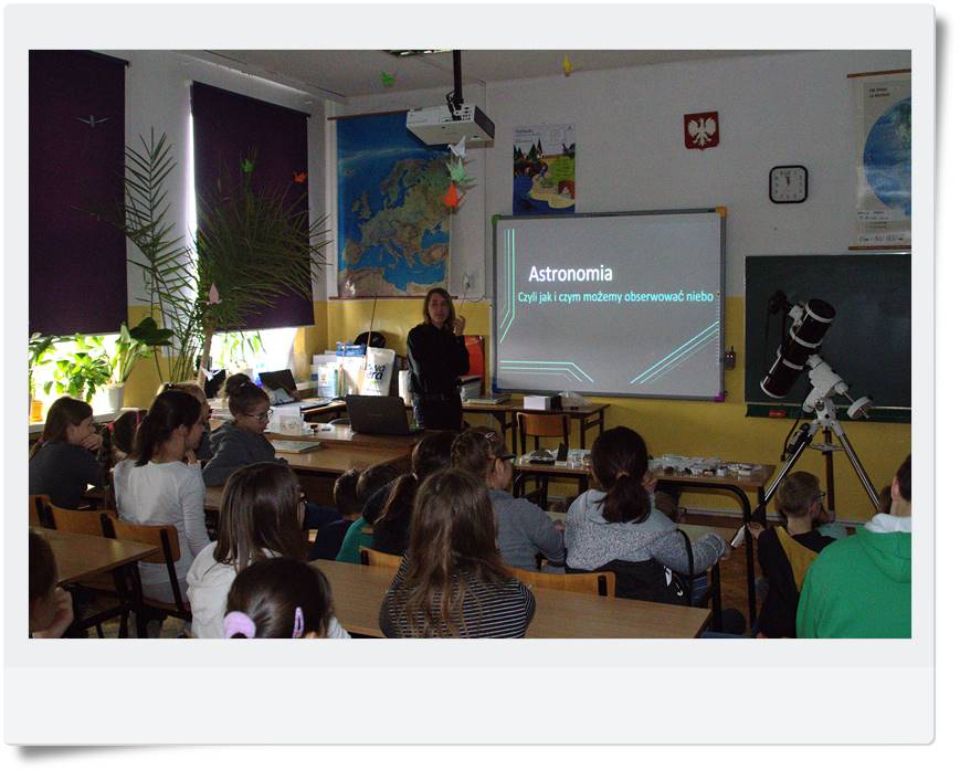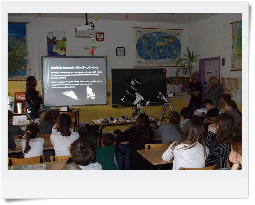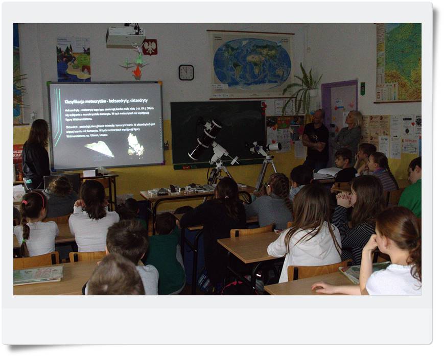 Dnia 19 kwietnia na 5 godzinie lekcyjnej uczniowie klas IV,V i VI wzięli udział w żywej lekcji astronomii, którą poprowadził starszy kolega- uczeń drugiej klasy gimnazjum-Łukasz. Nasi uczniowie mieli możliwość obejrzenia bardzo interesującej prezentacji, która zawierała fotografie ciał niebieskich wykonanych przez prelegenta. Obejrzeliśmy teleskopy oraz okazy kosmicznych skał. W taki sposób zainaugurowane zostały XXV Dni Ziemi.