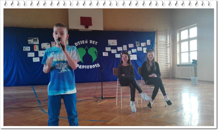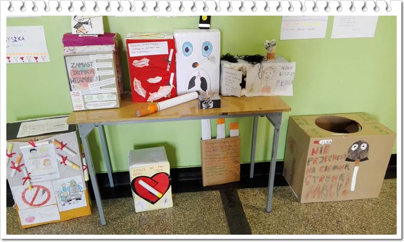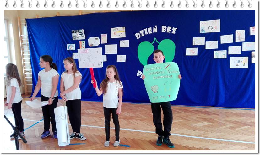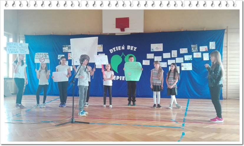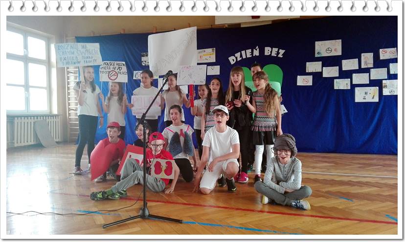W piątek 26 maja odbyło się podsumowanie wydarzeń szkolnych związanych ze Światowym Dniem Bez Papierosa. Pani Agata Szczepaniak i pani Marta Lach przygotowały przedstawienia, które w zabawny sposób przestrzegały o zgubnych skutkach palenia tytoniu. Rozstrzygnięte zostały też konkursy, które zorganizowała pani Agnieszka Sroka. W klasach drugich odbył się konkurs podsumowujący program profilaktyczny „Nie pal przy mnie proszę” – w jego części sprawdzającej wiedzę drugoklasistów bezkonkurencyjny okazał się Tymon Podanowski z klasy IIa, który jako jedyny prawidłowo odpowiedział na wszystkie pytania; w części sportowej konkurentów w tyle zostawił Filip Hauke również z klasy IIa, a najciekawszy plakat zaprojektował uczeń – i tu zaskoczenie – klasy… IIa Patryk Dubielak. Wszystkie klasy projektowały opakowanie mające na celu zniechęcenie do palenia papierosów i najskuteczniej zniechęciła do tego klasa VIa, natomiast w konkursie na wiersz o szkodliwości palenia na wyróżnienie zasłużyli: Darek Bijak kl. IIb, Damian Lekstan kl.IIIa i Mateusz Zając kl. VIa. Tego dnia uczniowie mogli też sprawdzić swą wiedzę na temat szkodliwości tytoniu biorąc udział w loterii, w której za każdą dobrą odpowiedź można było wybrać sobie nagrodę. Mamy nadzieję, że wszystkie te działania skutecznie zniechęciły dzieci do sięgania po papierosy, ale też dały do myślenia palącym rodzicom. Koordynatorem DNIA BEZ PAPIEROSA była pani Agnieszka Sroka