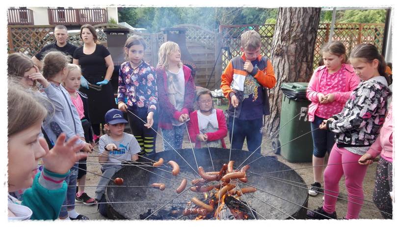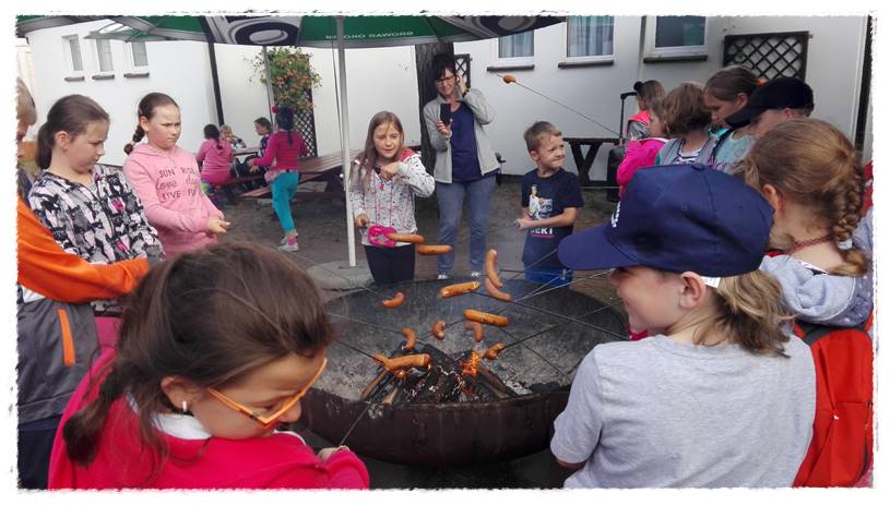 Z niecierpliwwością czekaliśmy na ognisko, na którym piekliśmy kiełbaski(mniam!), wcinaliśmy chleb ze smalcem i inne pyszności(aż się nam uszy trzęsły).