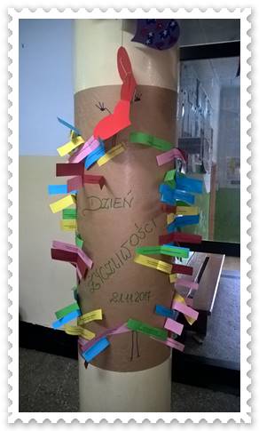 21 listopada obchodzony jest Światowy Dzień Życzliwości. Ideą tego dnia jest życzliwy uśmiech i spojrzenie, które mogą zdziałać o wiele więcej niż zwykła rozmowa. To dzień, w którym warto spojrzeć na codzienność inaczej, zapomnieć o trudnych chwilach. W tym roku Klub globalny we współpracy z Samorządem Uczniowskim przygotował akcję pod hasłem "Poczta życzliwości i pozdrowień". Uczniowie pisali miłe liściki, kartki, które wrzucali do kolorowego pudełka. W środę zostały wręczone adresatom. Było miło, a na twarzach malował się uśmiech. Klasy I- III wykonały piękne plakaty z magicznymi słowami oraz drzewka życzliwości, którymi przyozdobiły drzwi. Do akcji włączyła się świetlica szkolna. Klub globalny również przygotowywał się na tą okoliczność. Wycięte serca i kwiaty z pięknymi cytatami i przesłaniem dobra, przyjaźni i miłości ozdobiły wejście do szkoły. Zrobiło się przyjaźnie i kolorowo, jakby milej. Pozytywna energia i emocje udzieliły się każdemu. Nauczyciele rozmawiali z uczniami o tym, że to od nas zależy jacy będziemy wobec siebie. Uświadamiali uczniom, że z każdej sytuacji, nawet najtrudniejszej jest wyjście. Zawsze warto rozmawiać, przeprosić, być otwartym na drugiego człowieka, pozytywnie nastawiać się do siebie i świata. Pragniemy aby życzliwość była codziennością w naszej szkole.