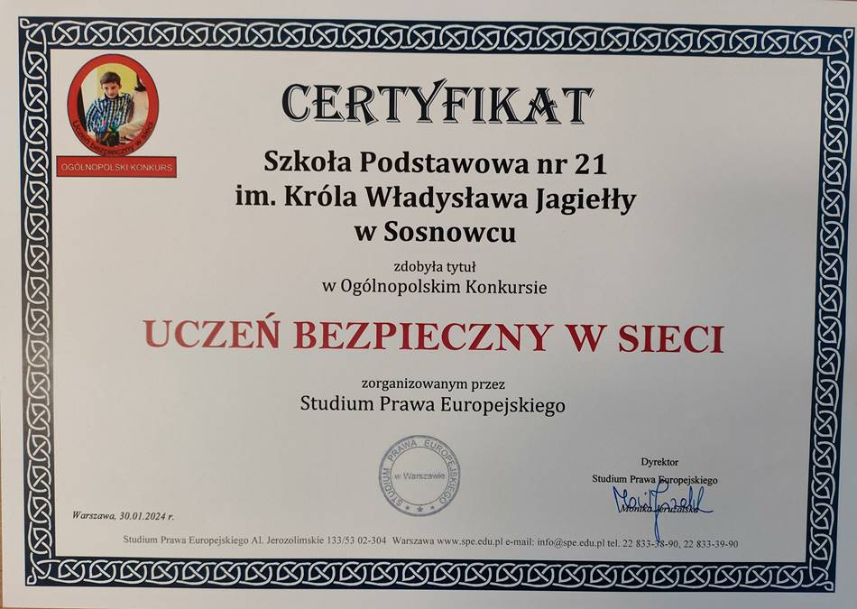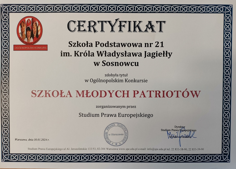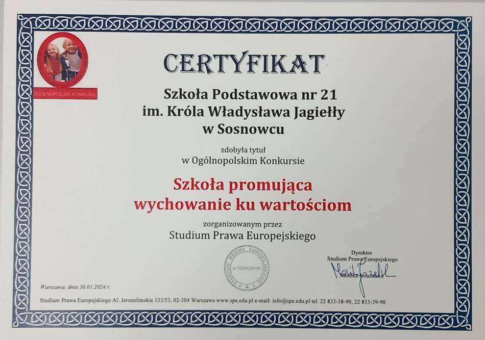 Realizacja działań podjętych w ramach projektów została oceniona pozytywnie przez komisję i w związku z powyższym nasza szkoła uzyskała certyfikat - „Szkoły Promującej wychowanie ku wartościom”, „Szkoły Młodych Patriotów” oraz „Uczeń bezpieczny w sieci”.