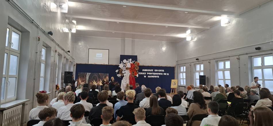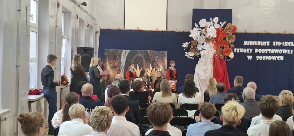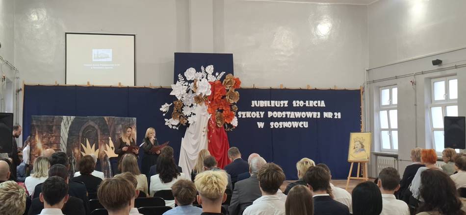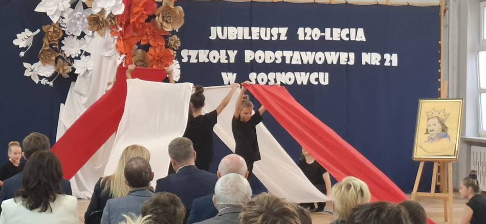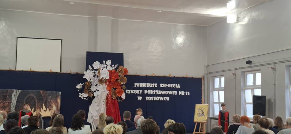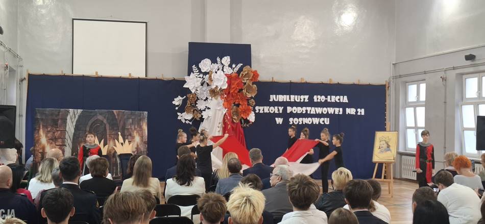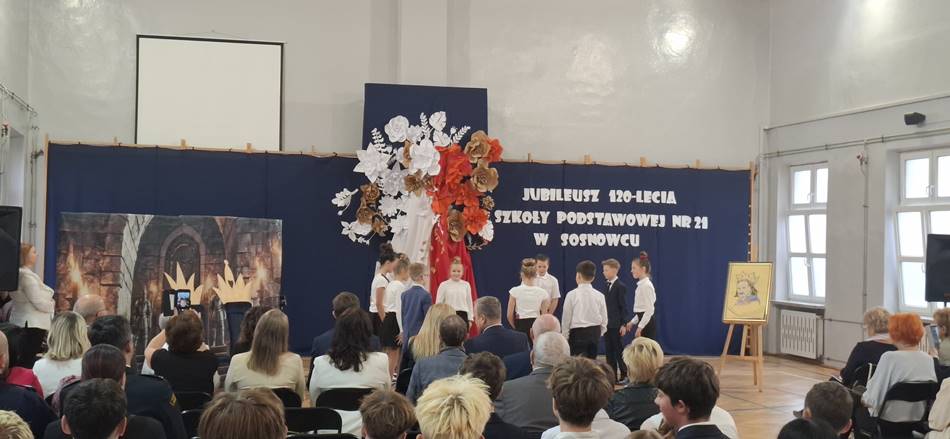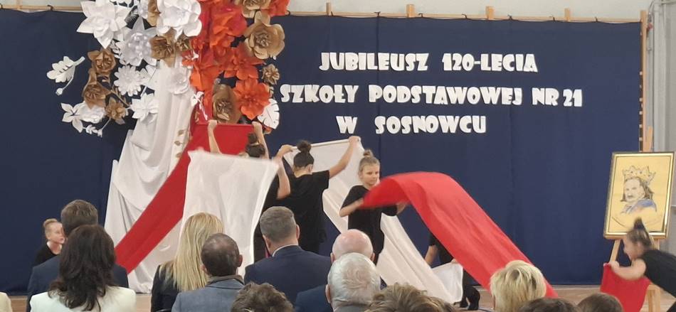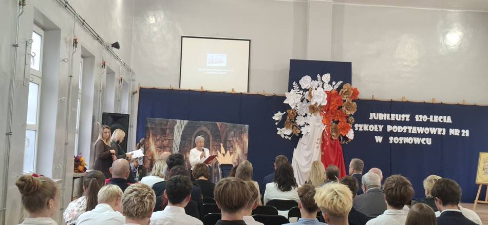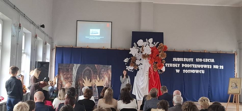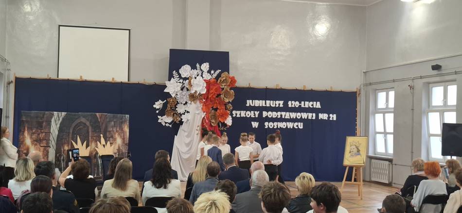 Dziś w naszej szkole miała miejsce kolejna uroczystość związana z obchodami 120- lecia szkoły. Na uroczystość przybyli zaproszeni goście m.in. Prezydent Miasta Sosnowiec Pan Arkadiusz Chęciński, Pani Anna Jedynak – Rykała Przewodnicząca Rady Miejskiej w Sosnowcu, Pan Mateusz Bochenek Poseł na Sejm Rzeczypospolitej Polskiej, Pani Daria Gosek – Popiołek Posłanka na Sejm Rzeczypospolitej Polskiej, Radni, Pan Rafał Łysy Rzecznik prasowy UM w Sosnowcu, przedstawiciel Wydziału Edukacji w Sosnowcu, Dyrektorzy Szkół Podstawowych, Dyrektor Przedszkola Miejskiego nr 20, przedstawiciel Państwowej Straży Pożarnej w Sosnowcu, Pan sierż. szt. Łukasz Sobczyk Dzielnicowy Komisariatu Policji IV w Sosnowcu, Pan Tomasz Kwiecień Koordynator wolontariatu w hospicjum im. św. Tomasza w Sosnowcu, emerytowani pracownicy szkoły oraz rodzice naszych uczniów. Pani Dyrektor Szkoły Krystyna Marglarczyk powitała przybyłych na uroczystość gości, odniosła się do najważniejszych momentów naszej szkoły. Pani Anna Urgacz – Szczęsna przedstawiła rys historyczny naszej placówki. Oprawę artystyczną przygotowali uczniowie z klas Va, Vb, VIa oraz Lilianna z klasy IIa, dziewczynki z klasy IVa pod opieką Pani B. Flaszy, Pani A. Szczepaniak oraz Pani J. Szkudlarek. Wśród występujących był również absolwent naszej szkoły Pan Maciej, który wykonał Bogurodzicę.