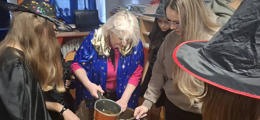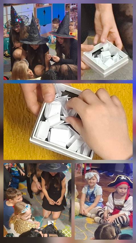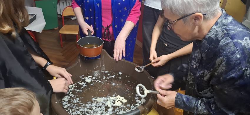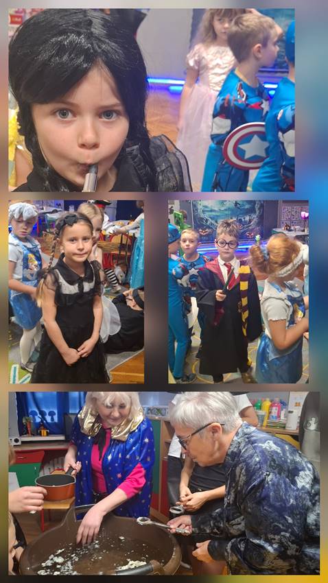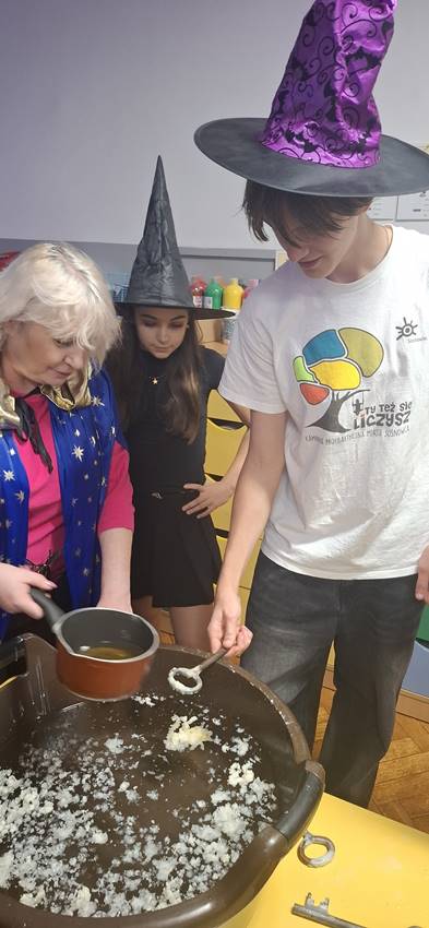 W przedszkolu panowała dziś wyjątkowa atmosfera, gdyż uczennice ze Szkolnego Koła Wolontariatu oraz chłopcy z Radiowęzła wspólnie z przedszkolakami przenieśli się do świata magii. Dzieci w pięknych kolorowych strojach tańczyły, wróżyły i cieszyły się wspólną zabawą. Na zakończenie wszyscy lali wosk i odczytywali swoją przyszłość z woskowych unikalnych kształtów. Ach co to był za dzień...
